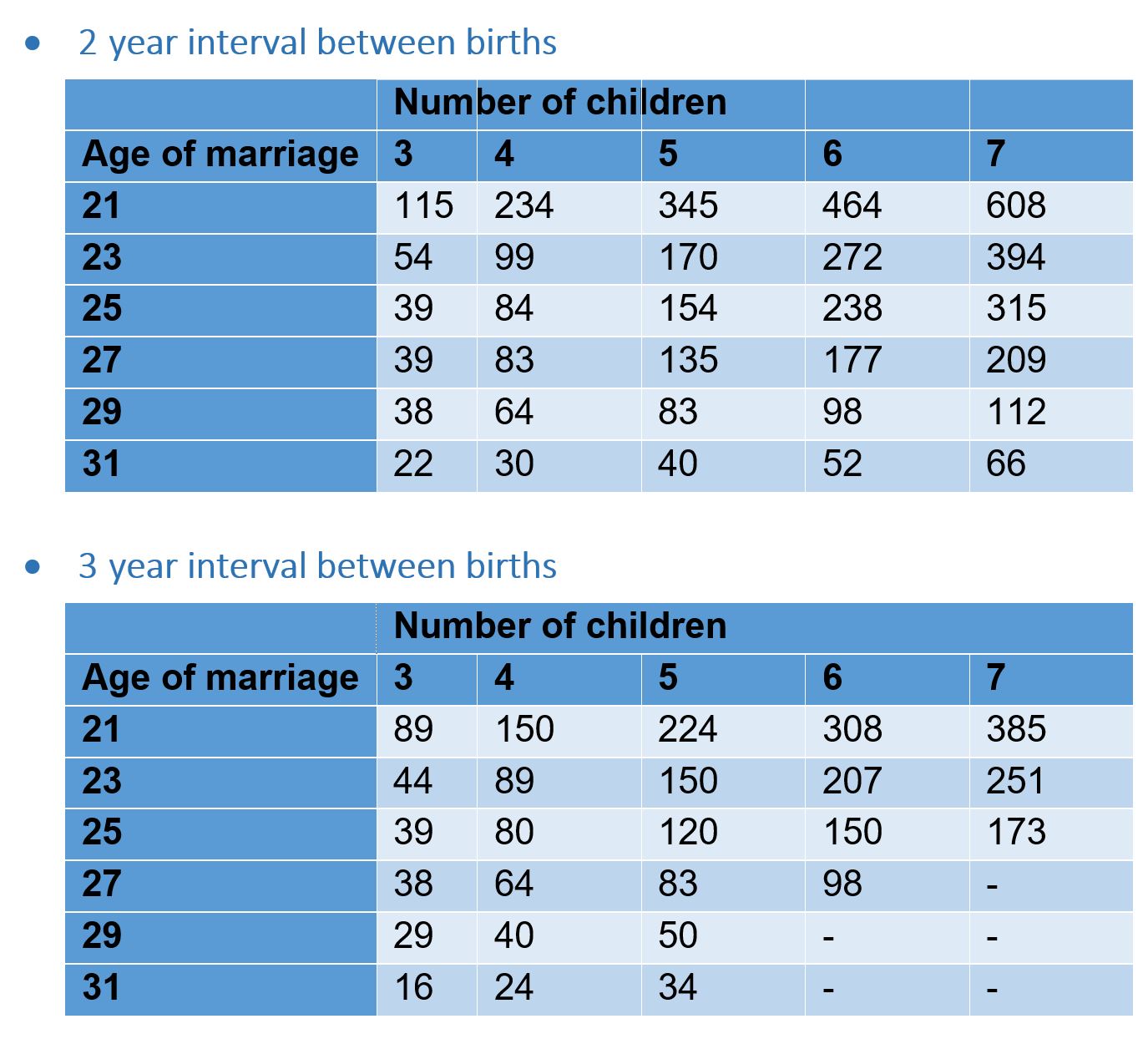 In order to realize this great and wonderful vision, it is important to present important information to those interested. Everyone knows that the number of children is a key component, but many are unaware of the crucial impact of the age one gets married and gives birth. To this end, I will add tables showing the effect the number of children and the age of marriage has on family growth.